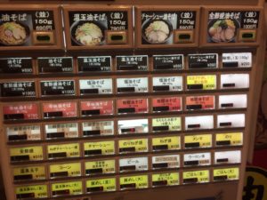食券タイプのようですね。頼んだメニュー「全部盛油そば(並:麺150g)」は、一番右上ですね。