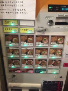 入店すると、非常に分かりやすくレイアウトされた食券機がお出迎え。18:30前という半端な時間に行ったためか店内は10席中8席しか埋まっておらず、待ち時間なく着席できました。とりあえずボリューミーなメニューを選択d( ̄  ̄)