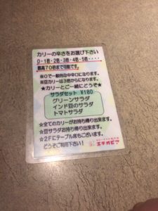少し前に入店した「神保町」のカレー屋「ボンディ」さんと同じスタイルですね♪(´ε` )そして、日本語がおぼつかない外人スタッフさんに「辛さどうしますか?0〜70まであります。」と言われ下記のメニューが登場。。。70の予想ができない上に、「0で一般的な中辛口になります。」と表記されていたので、とりあえず「0倍」を発注!